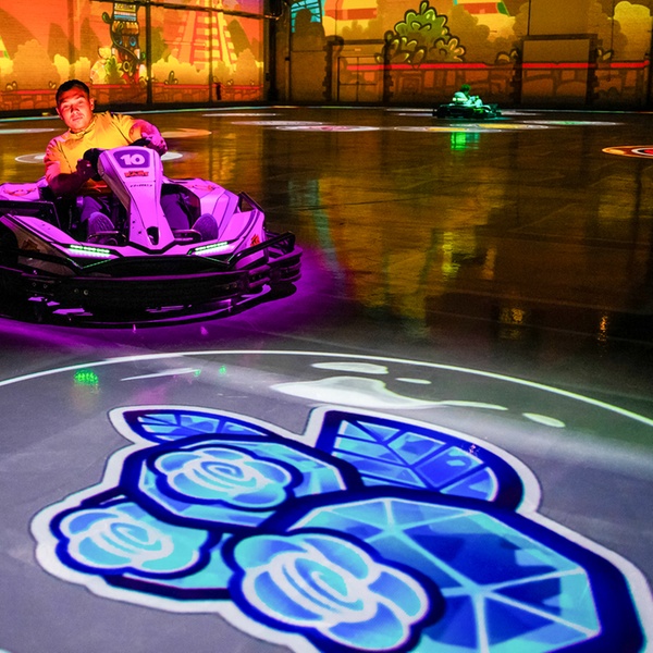They use a large number of projectors fixed to the ceiling of the hall to project different circuits and game modes onto the floor. Your kart is equipped with sensors and on-board electronics so that the karts interact with the elements on the track and with each other. For example, pick up a bonus square on the ground, and a rocket will appear on your dashboard. Press the yellow button, and the rocket will shoot off in front of your kart. If it hits one of your opponents, they’ll be slowed down for a few seconds, and you’ll be able to overtake them.