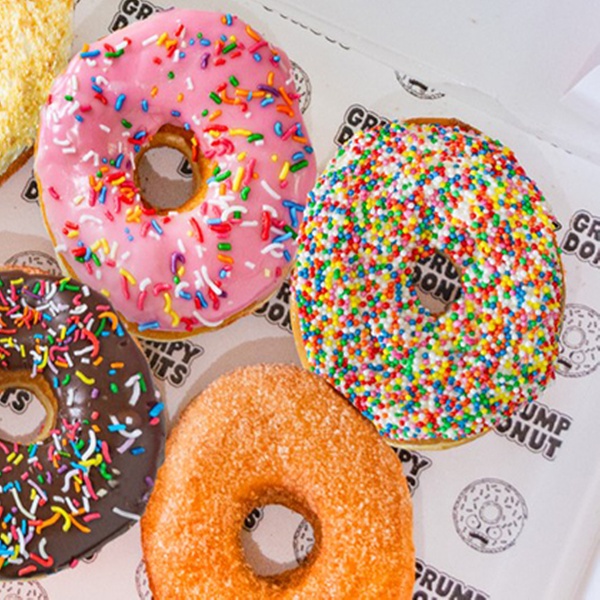 Premium fluffy US-style donuts with vegan options available in packs of 6 12 or 24 from cult favourite Grumpy Donuts in St Peters
