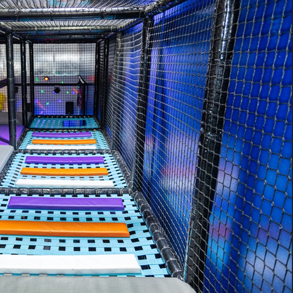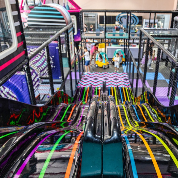 Main Zone (5-11 years) — The heart of the action, with trampolines, a ball pit, mini cars, and the main feature slide with neon lights.