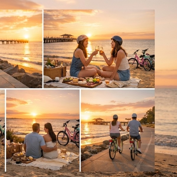 This offer provides an exceptional opportunity to experience the picturesque Moreton Bay foreshore, from the Redcliffe Peninsula to Shorncliffe/Sandgate, with unparalleled ease. The inclusion of pedal-assist e-bikes makes scenic exploration accessible and enjoyable for everyone, whether it's couples, friends, or families with children. Guests can effortlessly traverse coastal paths, taking in stunning views without the exertion often associated with cycling. The flexibility of choosing between a dynamic e-bike adventure with a curated picnic or a completely hands-off, luxurious beach picnic experience caters to diverse preferences for a perfect day out.