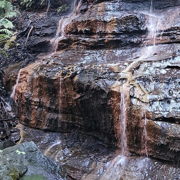 Katoomba Falls, where gentle cascades spill over ancient rock ledges surrounded by lush bushland.