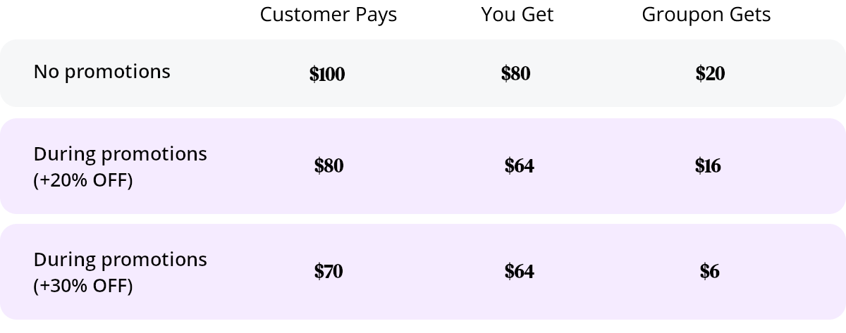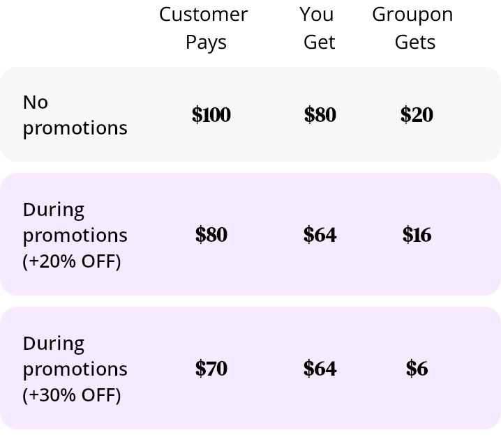 Groupon co-invests with you. We cut our profits and cover a portion of the cost of your promotion.
